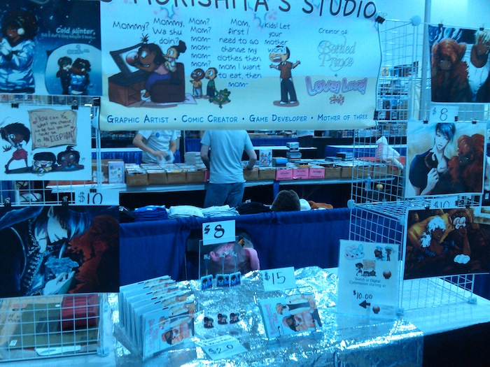 By Sunday I was ready to finally go home. I was so exhausted from everything and since Saturday was a kind of slow day I wasn’t sure how things would turn out on Sunday but thankfully I was able to meet so many nice people on Sunday, some didn’t even know that I was tabling there or didn’t notice my table until now. I also met a few people that saw my work online or that have contacted me through my website so that was a lot of fun! A few instances that stick out in my memory is when people would walk past and then stop and walk back to my table and talk to me about my characters and how rare it was to see black people in manga or anime. I kind of had to laugh to myself because it seemed like a lot of people were a little shy about saying the words “Black people” or they probably didn’t know how to say it without being afraid that I might get offended. There was even one gentleman who said to me “I don’t want to sound like a racist but you don’t see a lot of black people in anime.” and that just made me bust out laughing and I agreed with him that there really isn’t a lot. I didn’t think that was racist at all so for some reason his comment really made me laugh. I’m a pretty laid back type of person so I don’t mind being called black or brown. I prefer being called by my skin color then someone calling me by a certain stereotypical nationality. Not all black people are from Africa so I don’t want to be called African American because that isn’t correct and most people wouldn’t know that because they don’t know my family history, my grandfather is mixed, his parents are white and Indian so you can see how me and my sisters are kind of jumbled together in a mixing pot of different races. Now some would rather be called that which is okay but that’s not for me because I’d rather not go all in to my family history so that a stranger will understand why they are incorrect when they might call me African American. I’m just an American or if you want a black or brown American. So after that funny little chatter between that young man I had the pleasure to met two very kind young ladies who are actually from the same city as me. I remember one of the girls name was Montgomery and I only remember this because I had some issues spelling it because my brain was so tired and just about wiped out ^^; Anyways I had so much fun talking with her and was so touched by how happy she was to see a comic/manga with a heavy set darker skinned girl. She was such a pleasure to talk to and I hope to see her and her friend again at the local comic conventions, one being the Iowa Comic Book Club that should be in October.
