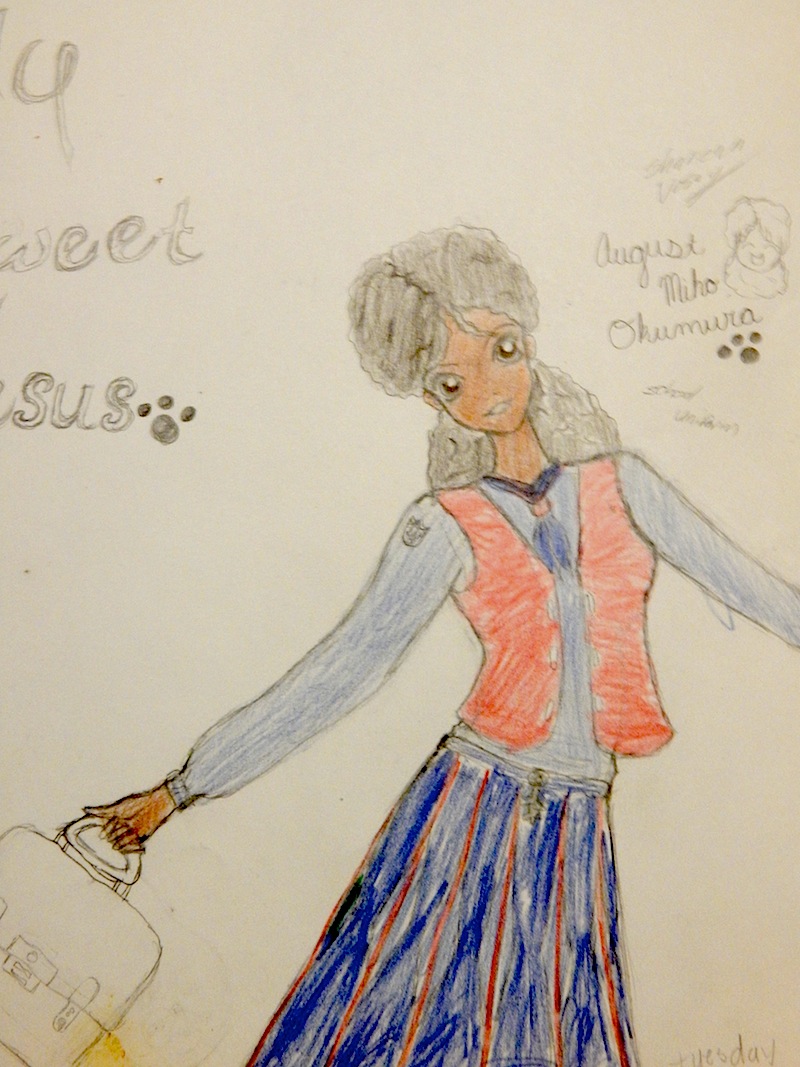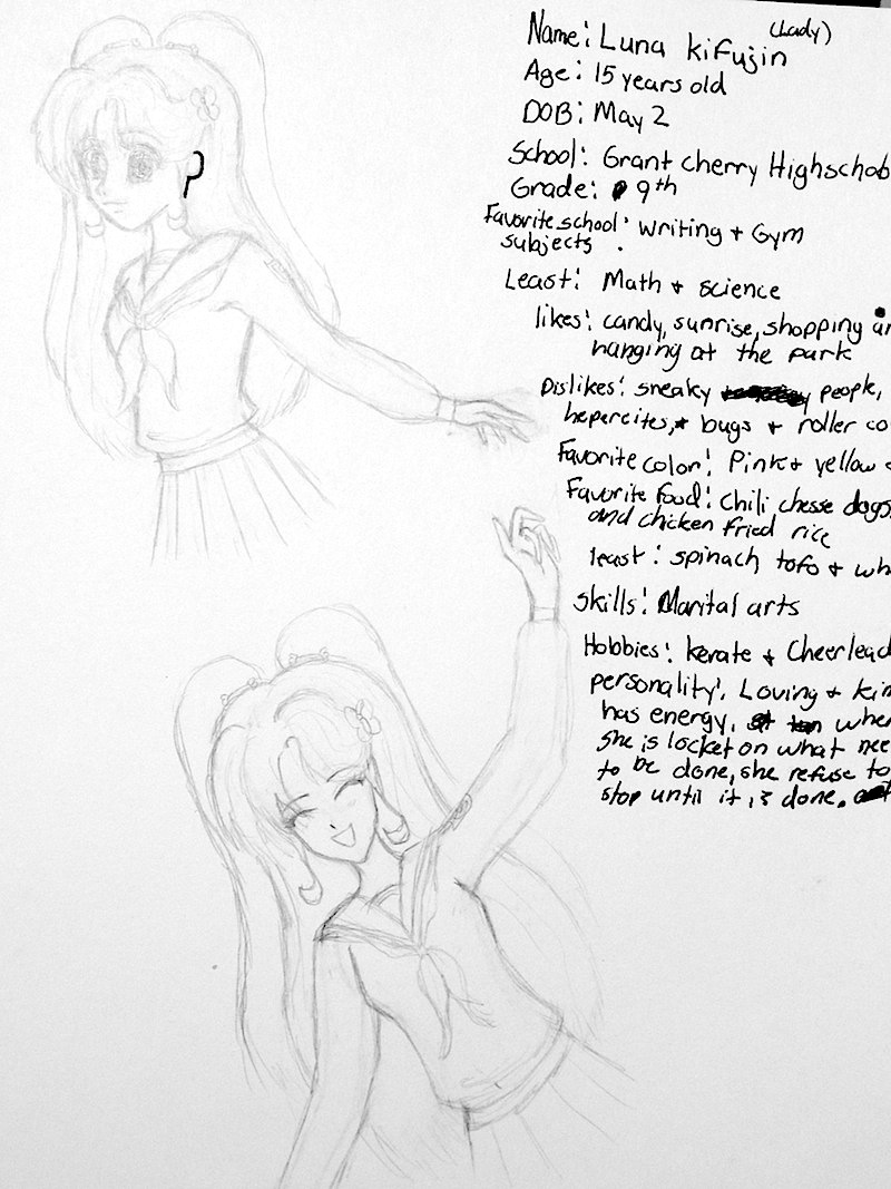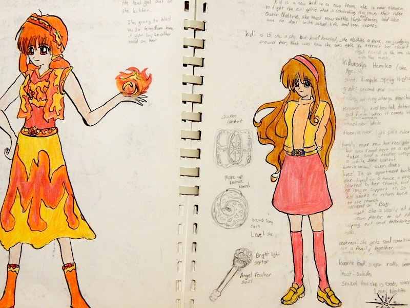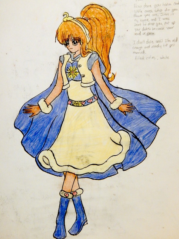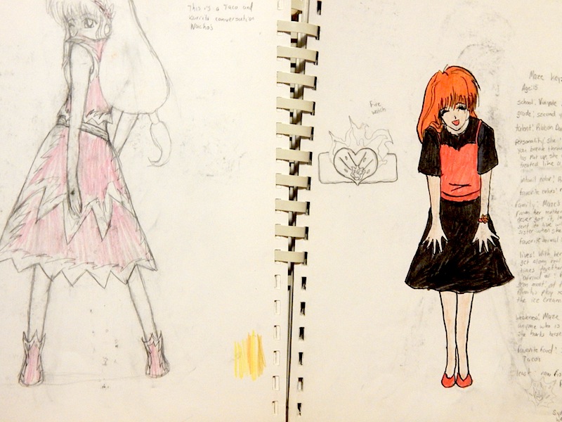 I’ll share a little small flash back of how I found my own personal style. When I first started out I of course was very influenced by the humor of Jim Davis, the colorfulness of Rainbow Bright and the pretty bad guy fighting sparkles of Sailor moon. Here are pictures that I took of my old drawings, I think I drew these back when I was 14. I hope the quality doesn’t bother you too much, I’m not looking to battle it out with the scanner/printer/copier machine to get it to work ^^;